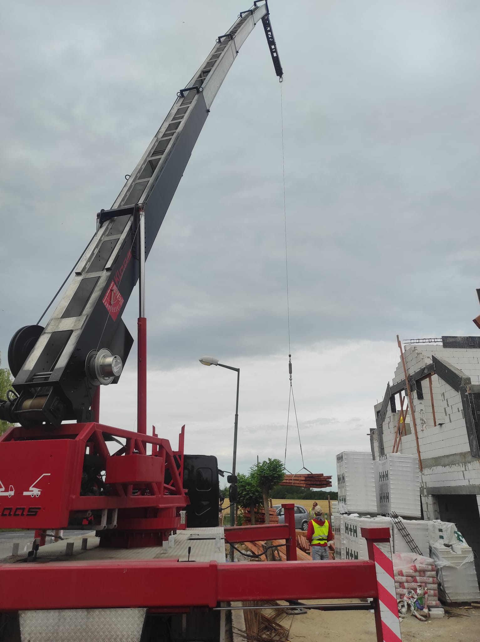Rozładunek palet, stali, drewna, płyt i innych materiałów na placu budowy.